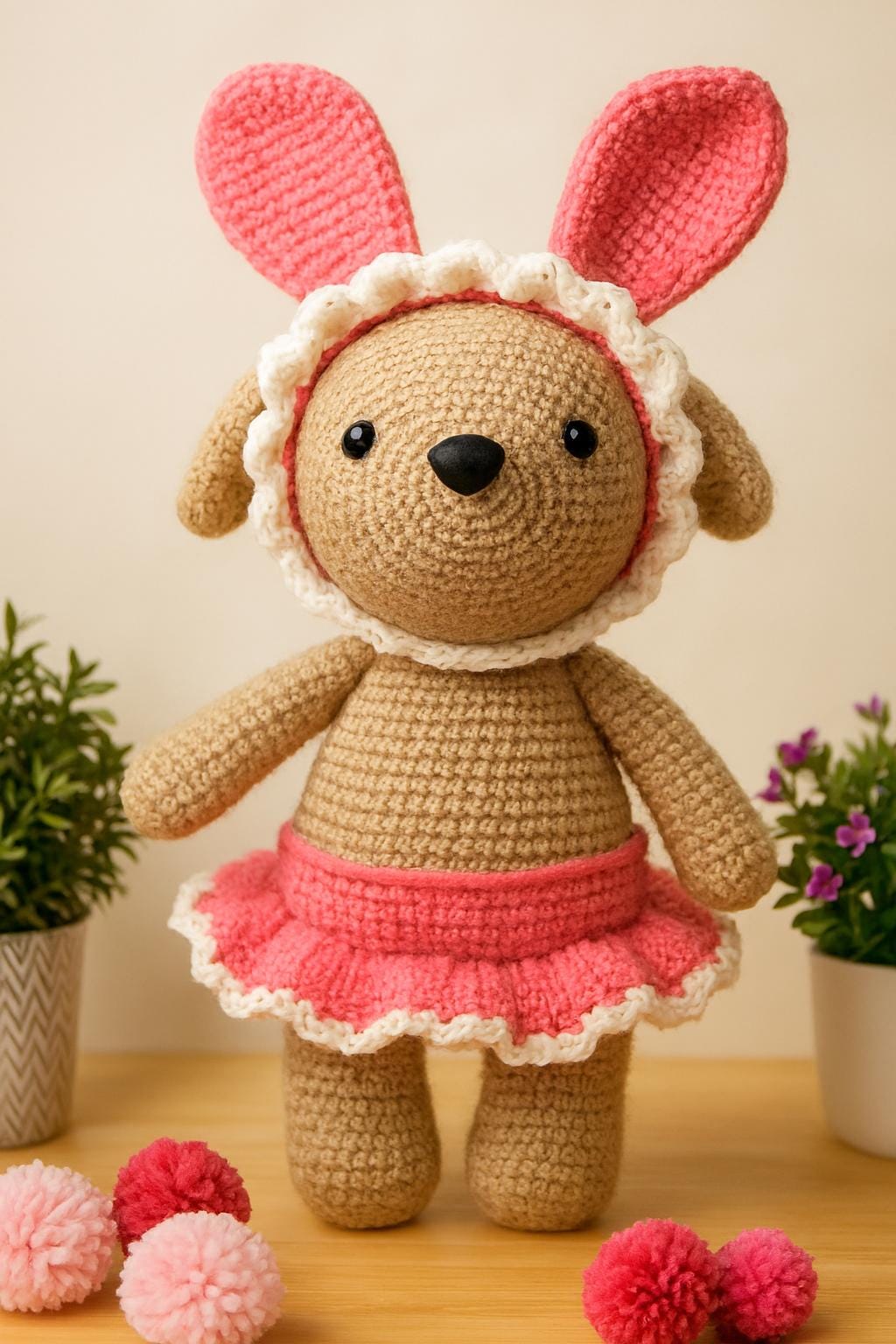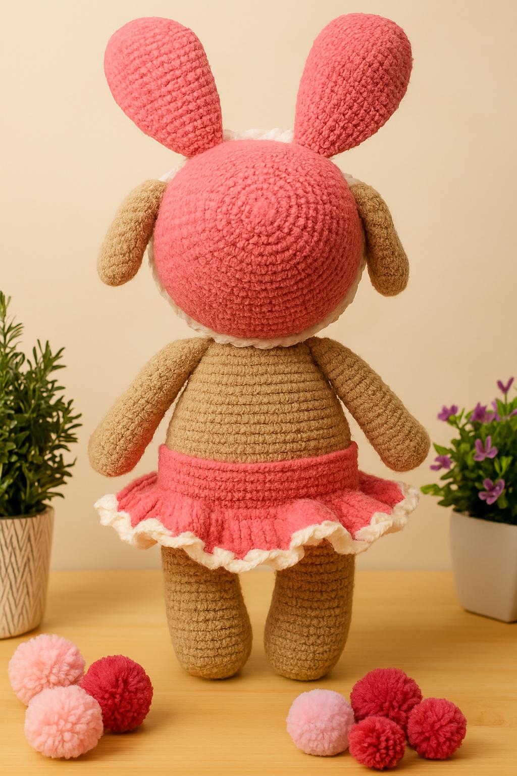 Meet your new cuddle companion! This handmade crochet bunny is crafted with love and attention to detail, featuring a soft tan body, a ruffled pink skirt, and a whimsical bunny hood with oversized ears and a scalloped trim.