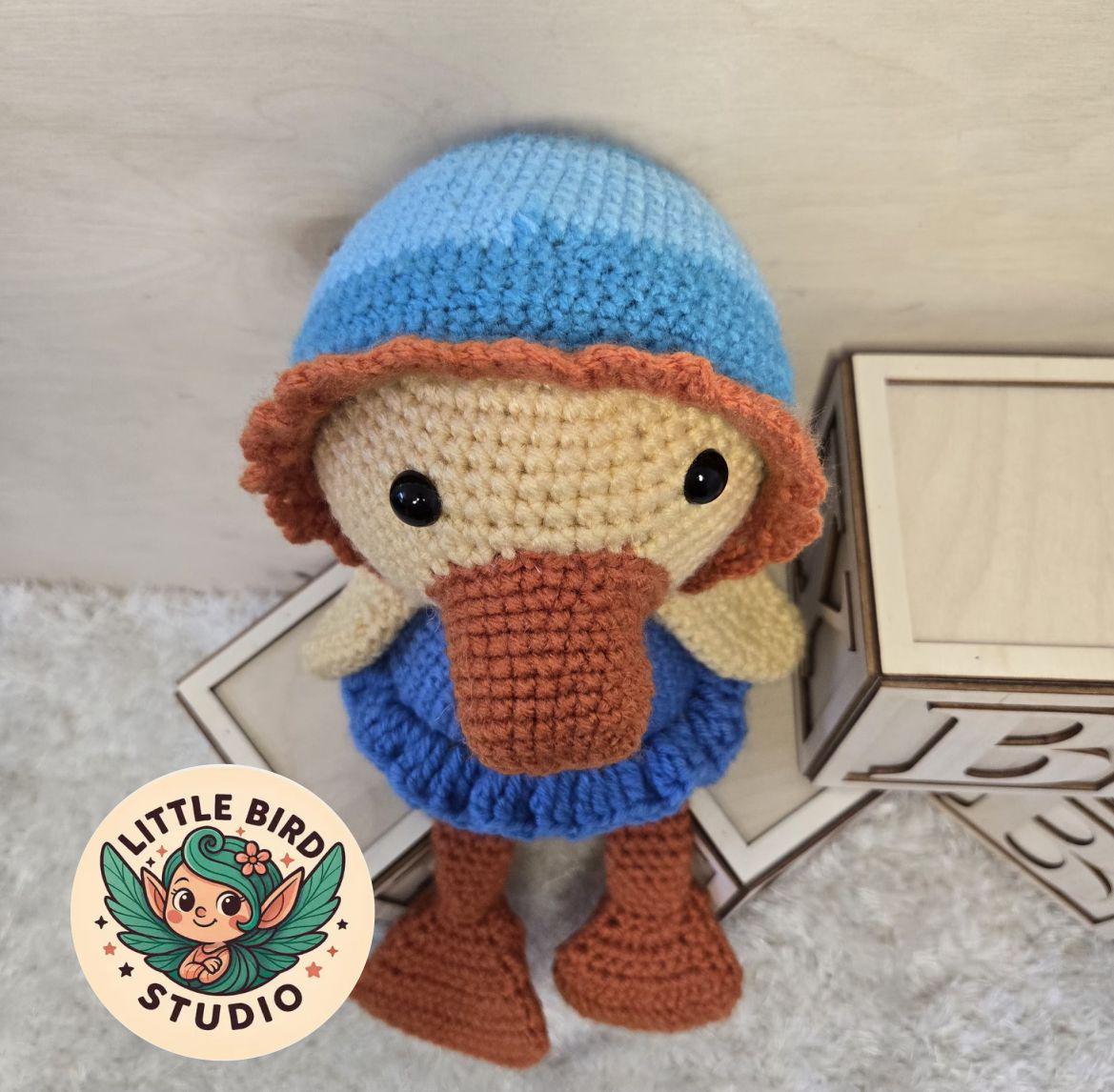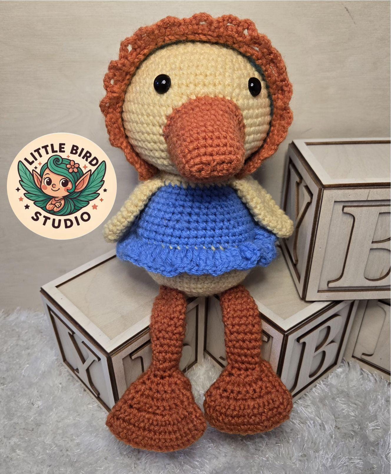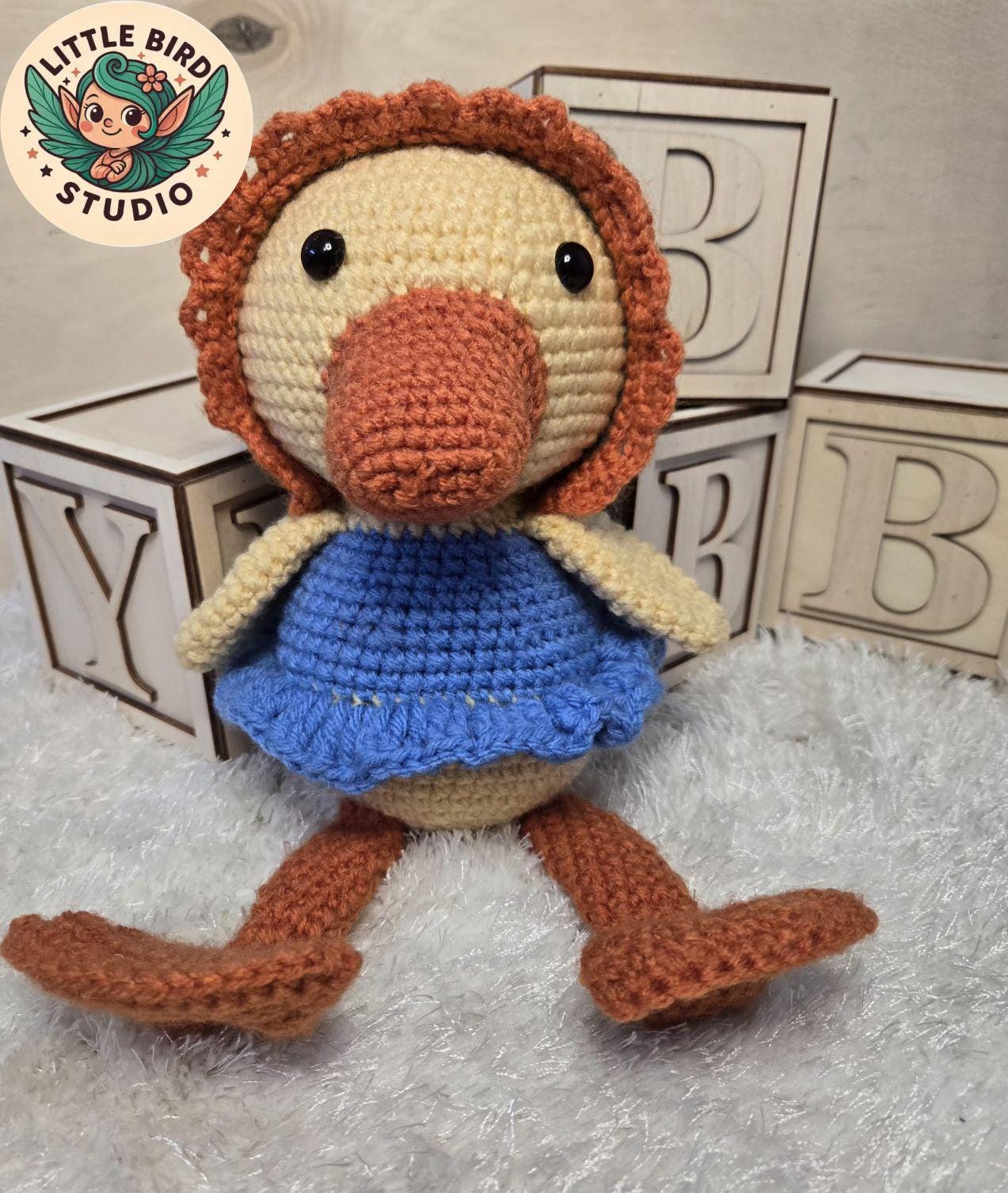 Lovingly handmade in the amigurumi style, this crocheted duck doll is dressed to charm in a frilled orange bonnet and a soft blue dress. With a beige body, orange beak and feet, and gentle stitching throughout, she’s the perfect companion for nursery shelves, baby showers, or whimsical decor