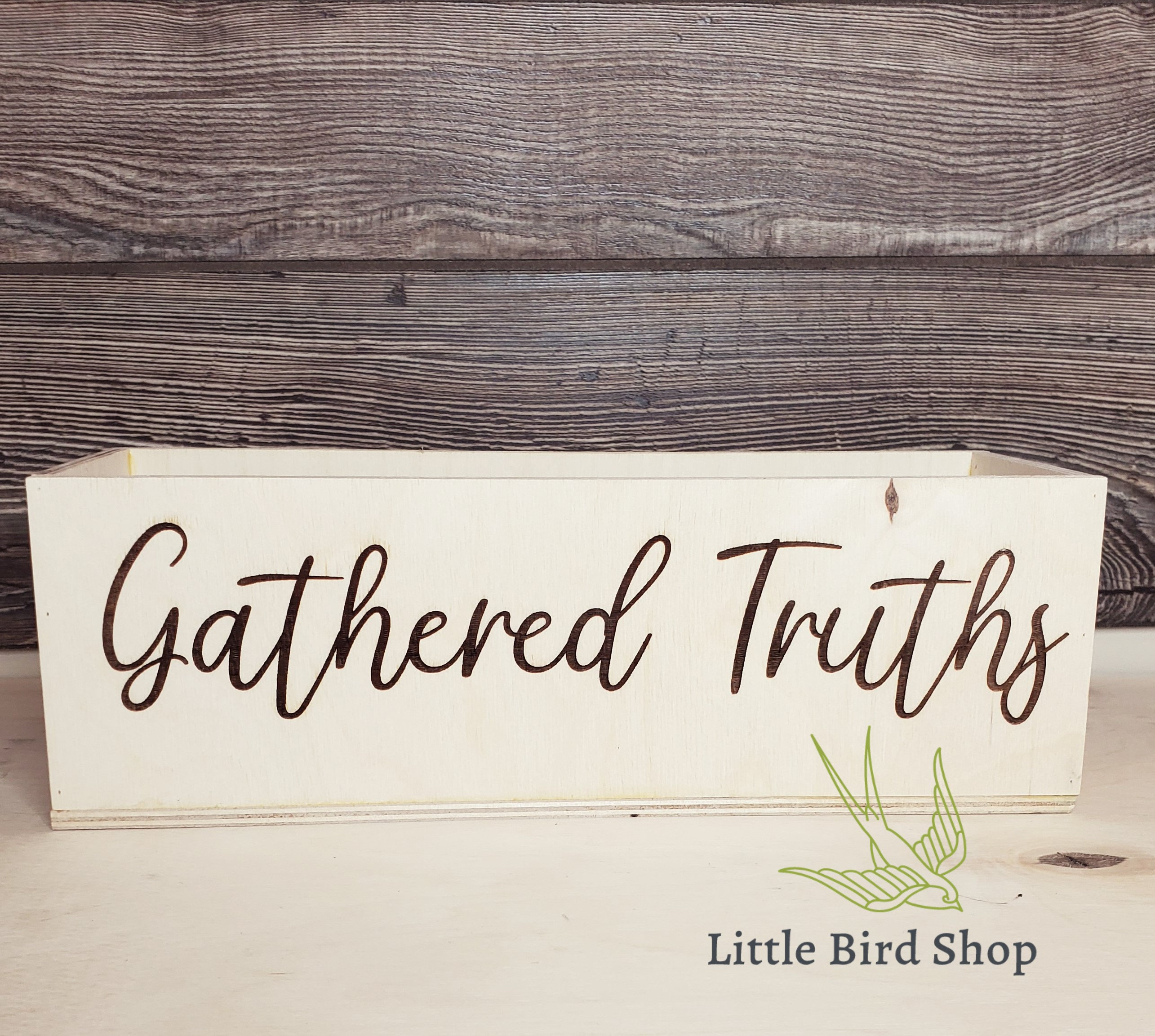 The box is unfinished and a perfect canvas for whatever you would like to put on it. The box looks great as a table centerpiece with flowers in it or whatever else you need to put in one. These are very popular for wedding or house party decorations!